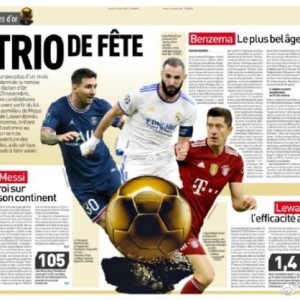体坛周报全媒体原创 尽管金球奖投票10月24日才截止,但《队报》造势称,今年金球奖争夺可能在梅西、莱万多夫斯基和本泽马...