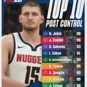 北京时间8月15日,NBA 2K官方公布低位背打能力值TOP10:约基奇98高居联盟第一;恩比德96联盟第二;小萨博尼斯...